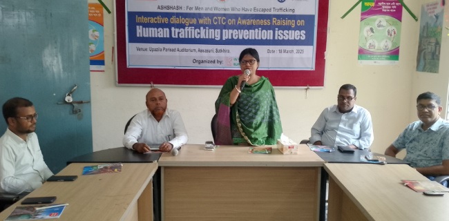 উপজেলা নির্বাহী অফিসার কৃষ্ণা রায়ের  সভাপতিত্বে সভায় ইউনিয়ন ও উপজেলা পর্যায়ের মানব পাচার প্রতিরোধ কমিটির সদস্যবৃন্দ উপস্থিত ছিলেন। স্বাগত বক্তব্য বাখেন, উপজেলা মহিলা বিষয়ক কর্মকর্তা ও কমিটির সদস্য সচিব মোঃ সাইদুল ইসলাম। আশ্বাস প্রকল্পের প্রোগাম অফিসার দীপ্তি রায়ের সঞ্চালনায় প্রকল্পের কার্যক্রম ও কমিটির ৩ মাসের পরিকল্পনা সম্পর্কে  আলোচনা করা হয়। মানবপাচার প্রতিরোধে কার্যকর পদক্ষেপ গ্রহণ ও কমিটির সদস্যদের দায়িত্ব এবং সারভাইভারদের সুরক্ষার জন্য করণীয় বিষয় সম্পর্কে আলোচনা করেন উপজেলা নির্বাহী অফিসার কৃষ্ণা রায়। তিনি বলেন, মানবপাচার প্রতিরোধ ও জনসচেতনতা সৃষ্টির লক্ষ্যে সকল দপ্তর ও প্রতিষ্ঠানকে কার্যকর পদক্ষেপ গ্রহণ করতে হবে। এসময় শোভনালী ইউপি চেয়ারম্যান মাওঃ আবু বক্কর সিদ্দিক, যুব উন্নয়ন কর্মকর্তা সঞ্জীব কুমার দাস, উপজেলা শিক্ষা কর্মকর্তা স্বপন কুমার বর্মন, মাধ্যমিক শিক্ষা কর্মকর্তা মোঃ আতিয়ার রহমান, প্রেস ক্লাবের সভাপতি জি এম আল ফারুক, বড়দল ইউপির প্রশাসক আক্তার ফারুক বিল্লাল, আনসার ভিডিপি কর্মকর্তা আরিফা খাতুন ও আশাশুনি দাখিল মাদ্রাসার সুপার ড. আবুল হাসান প্রমুখ উপস্থিত ছিলেন।