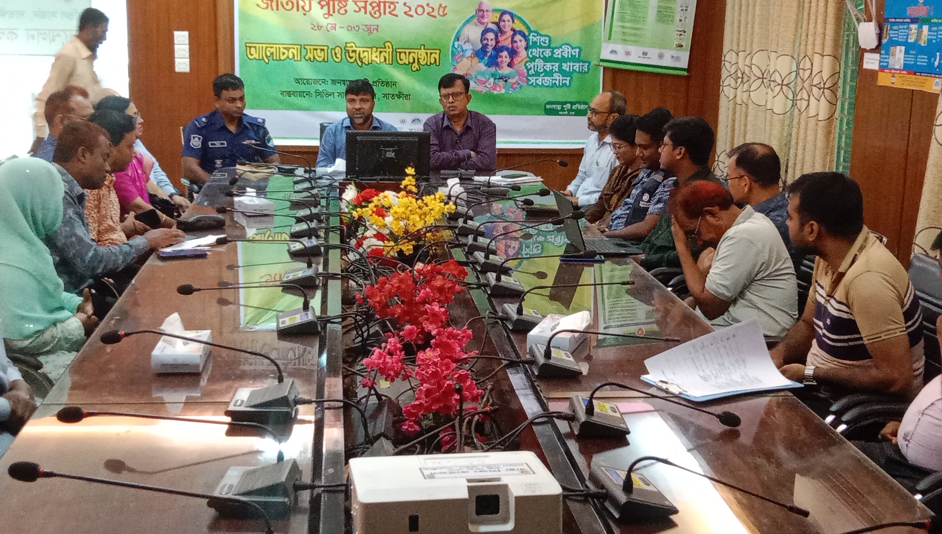 বিশেষ অতিথি হিসেবে বক্তব্য রাখেন অতিঃ পুলিশ সুপার ডিএসবি মিথুন সরকার, জেলা পরিবার পরিকল্পনা অধিদপ্তরের সহকারী পরিচালক ডাঃ প্রবীর মুখার্জি, সদর উপজেলা স্বাস্থ্য পঃপঃ কর্মকর্তা ডাঃ ফরহাদ জামিল, মেডিকেল অফিসার ডাঃ জয়ন্ত কুমার সরকার, ডাঃ সুমনা সুলতানা প্রমুখ।উল্লেখ্য ২৮ মে থেকে ০৩ জুন পর্যন্ত দেশব্যাপী জাতীয় পুষ্টি সপ্তাহ উদযাপন হচ্ছে। তারই ধারাবাহিকতায় সাতক্ষীরায় উক্ত পুষ্টি সপ্তাহ পালিত হচ্ছে।এসময় বক্তারা বলেন, শিশু জন্মের পরপরই শাল দুধ খাওয়ানো ও শিশুদের পুষ্টি জাতীয় খাদ্য সম্পর্কে জনসচেতনতা বৃদ্ধি করতে হবে। সুস্থ্য জীবনের জন্য অতিরিক্ত ভাজা, তৈলাক্ত খাবার ও ফাস্টফুড বর্জন করতে হবে। খাবারে চিনি ও লবনের মাত্রা সব সময় সীমিত রাখতে হবে। এছাড়া বাচ্চাদের খাবারের ব্যাপারে পরিবার পর্যায়ে অবশ্যই সচেতন হবে। বসত ভিটায় বেশি বেশি সবজি চাষ করতে হবে।এসময় স্বাস্থ্য বিভাগের কর্মকর্তা ও বিভিন্ন সরকারি দপ্তরের কর্মকর্তারা উপস্থিত ছিলেন। সমগ্র অনুষ্ঠান সঞ্চালনা করেন সিভিল সার্জন অফিসের সিনিয়র স্বাস্থ্য শিক্ষা কর্মকর্তা মাহবুবুর রহমান।