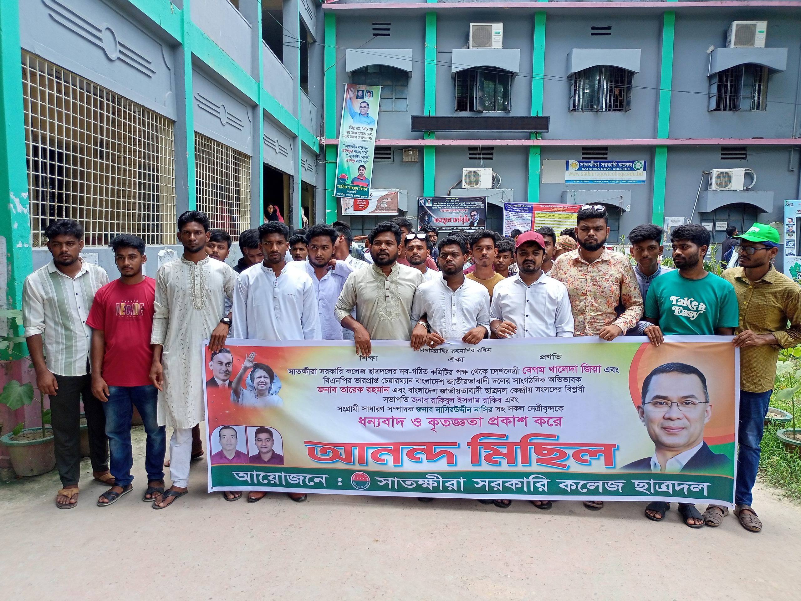 সাতক্ষীরা সরকারী কলেজ ছাত্রদলের নবগঠিত কমিটির পক্ষ থেকে বিএনপি চেয়ারপার্সন বেগম খালেদা জিয়া ও ভারপ্রাপ্ত চেয়ারম্যান তারেক রহমান এবং কেন্দ্রীয় ছাত্রদলের সভাপতি রাকিবুল ইসলাম ও সাধারন সম্পাদক নাছির উদ্দীনসহ সকল নেতৃবৃন্দকে ধন্যবাদ ও কৃতজ্ঞতা প্রকাশ করে আনন্দ মিছিল অনুষ্ঠিত হয়েছে। সরকারী কলেজ ছাত্রদলের আয়োজনে মঙ্গলবার সকাল ১১টায় কলেজ ক্যাম্পাস চত্বরে এ আনন্দ মিছিল অনুষ্ঠিত হয়।