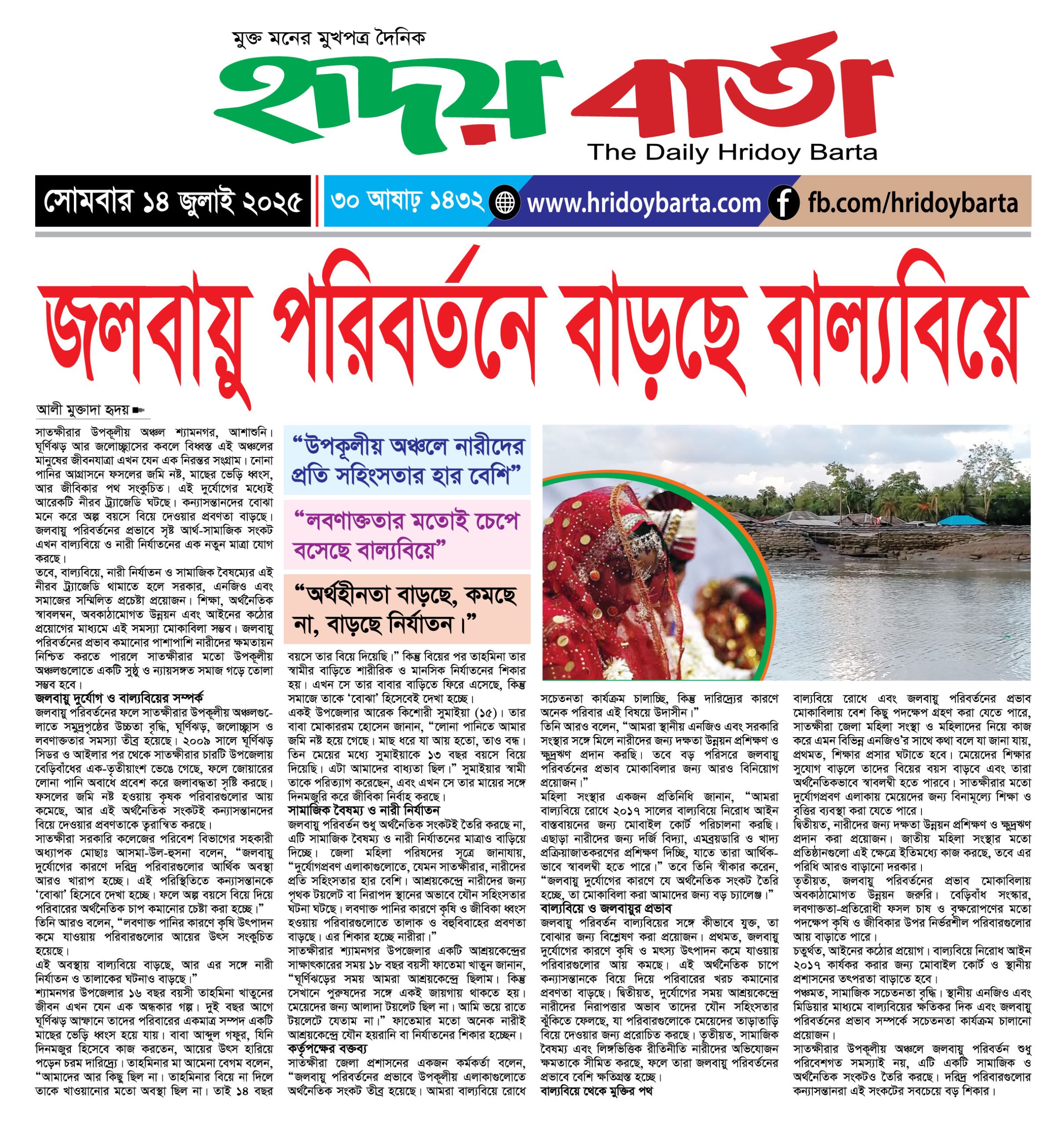 সাতক্ষীরার উপকূলীয় অঞ্চল শ্যামনগর, আশাশুনি। ঘূর্ণিঝড় আর জলোচ্ছ্বাসের কবলে বিধ্বস্ত এই অঞ্চলের মানুষের জীবনযাত্রা এখন যেন এক নিরন্তর সংগ্রাম। নোনা পানির আগ্রাসনে ফসলের জমি নষ্ট, মাছের ভেড়ি ধ্বংস, আর জীবিকার পথ সংকুচিত। এই দুর্যোগের মধ্যেই আরেকটি নীরব ট্র্যাজেডি ঘটছে। কন্যাসন্তানদের বোঝা মনে করে অল্প বয়সে বিয়ে দেওয়ার প্রবণতা বাড়ছে। জলবায়ু পরিবর্তনের প্রভাবে সৃষ্ট আর্থ-সামাজিক সংকট এখন বাল্যবিয়ে ও নারী নির্যাতনের এক নতুন মাত্রা যোগ করছে।