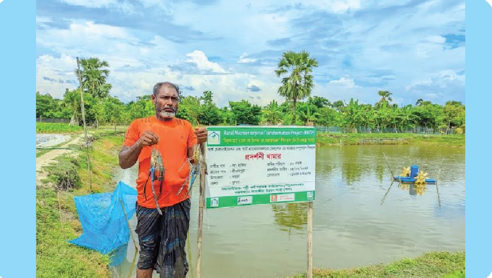 এরপর আসে ২০২০ সালের ঘূর্ণিঝড় আমফান। এক ঝড়ে ভেসে যায় তাঁর ঘের, নষ্ট হয় সব মাছ। ঘরবাড়িও ক্ষতিগ্রস্ত হয়। দিশেহারা হয়ে পড়েছিলেন হালিম। ঠিক সেই সময়ে পাশে দাঁড়ায় সাতক্ষীরা উন্নয়ন সংস্থা (সাস) এবং পিকেএসএফ, ইফাদ ও ডানিডার সহায়তায় পরিচালিত আরএমটিপি প্রকল্প। তাঁকে দেওয়া হয় আধা-নিবিড় চাষ পদ্ধতি, পানি ব্যবস্থাপনা, সঠিক খাবার সরবরাহ, রোগ প্রতিরোধসহ আধুনিক প্রযুক্তিভিত্তিক প্রশিক্ষণ এবং ঘের সংস্কার ও পোনা কেনার আর্থিক সহায়তা।