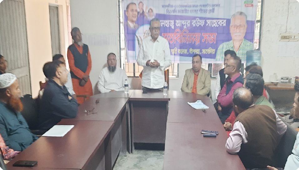 আসন্ন ত্রয়োদশ জাতীয় সংসদ নির্বাচনকে সামনে রেখে সাতক্ষীরা-২ (সাতক্ষীরা সদর–দেবহাটা) আসনে বিএনপি মনোনীত ধানের শীষের প্রার্থী, গণমানুষের প্রিয় ও জননন্দিত নেতা আলহাজ্ব মো. আব্দুর রউফকে ঘিরে শহীদ স্মৃতি কলেজে অনুষ্ঠিত হলো প্রাণবন্ত মতবিনিময় সভা।